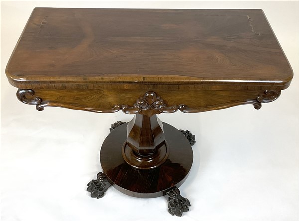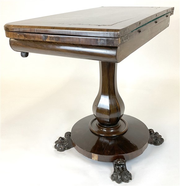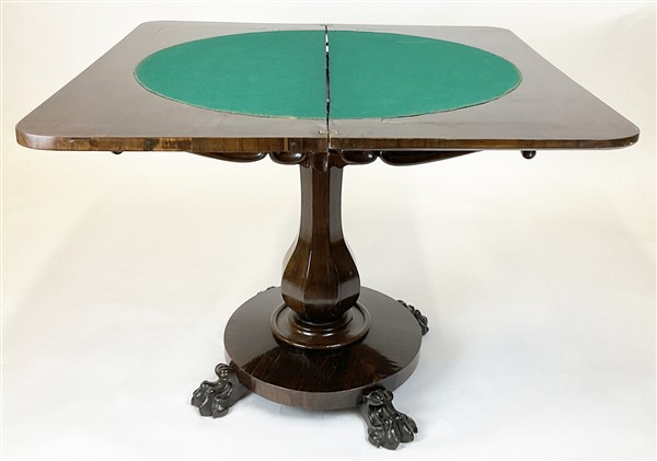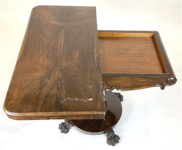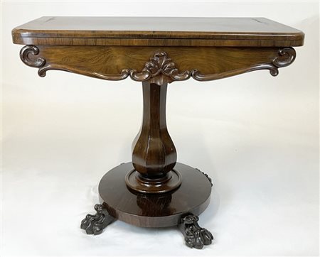 Tavolino da gioco lastronato in palissandro con piano a libro, sostegno a balaustro su base circolare e piedi ferini (chiuso cm 90x71x45) (difetti e mancanze)