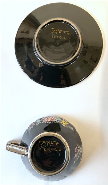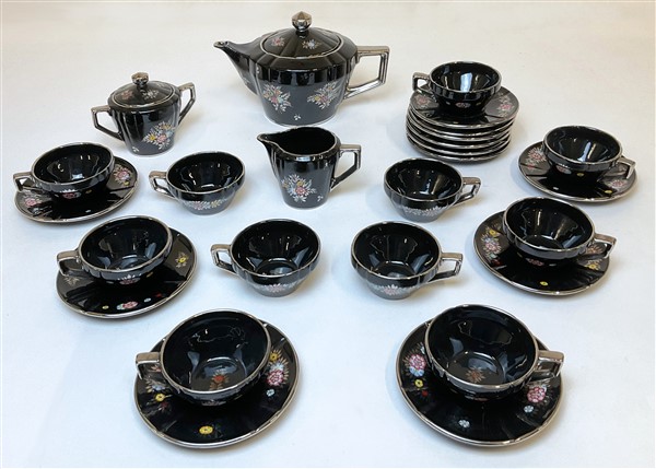 Lotto composto da parte di servizio da té in porcellana Limoges e parte di servizio da té in ceramica a fondo nero, Deruta Perugia (h. max cm 22) (difetti)