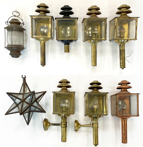 Lotto composto da otto diverse lanterne in metallo e vetro unite ad un piccolo lampadario a stella. In un cartone (h. max cm 40) (difetti e mancanze)
