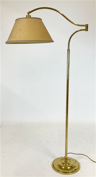Lampada da terra in metallo dorato con paralume in stoffa. Italia, anni '80. (h min cm 162) (difetti)