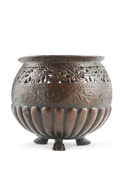 Contenitore in rame sbalzato e decorato a motivi floreali