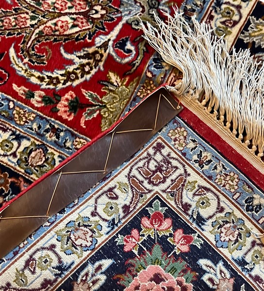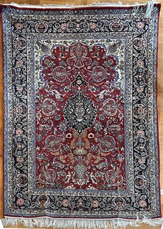 Tappeto preghiara Tabriz, Persia, secolo XX. Decoro con piccolo medaglione a fondo blu con puntali e lampada votiva su campo rosso decorato con Boteh, volatili e rami fioriti, alla base una mensola che regge un vaso fiorito. Bordura Herati policroma su fondo blu notte (cm 236x155) (difetti)