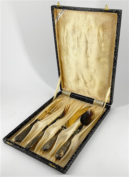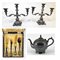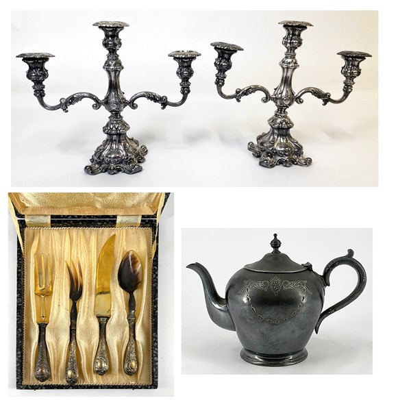 Lotto composto da coppia di candelabri a tre fiamme, un'antica teiera e un set di posate da portata in custodia in metallo argentato e altri materiali (difetti) (h. max cm 31,5)