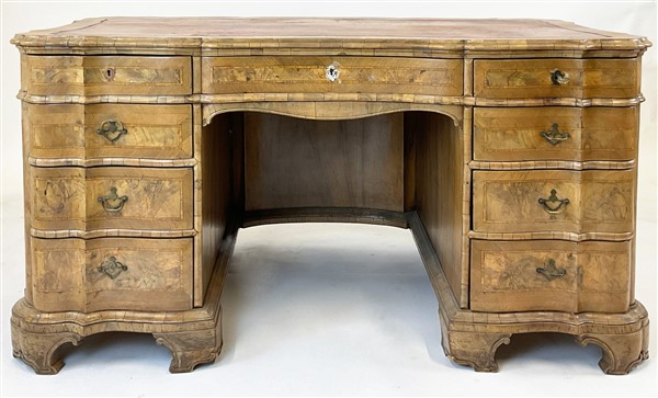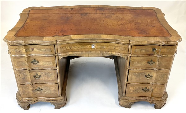 Scrivania da centro di forma mossa con specchiature in radica e filettate, fronte con quattro cassetti sui due lati e uno centrale, piano con inserto in cuoio (cm 150x79x78) (difetti)