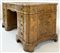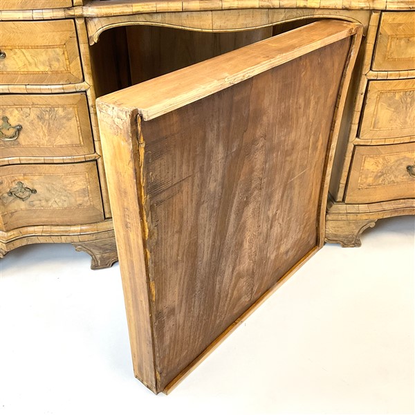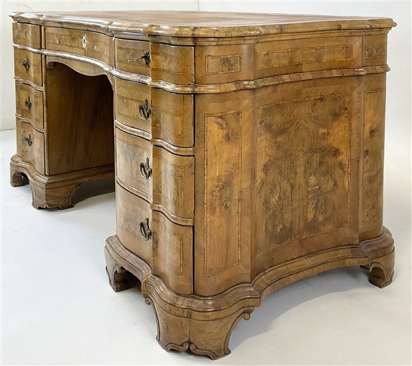 Scrivania da centro di forma mossa con specchiature in radica e filettate, fron