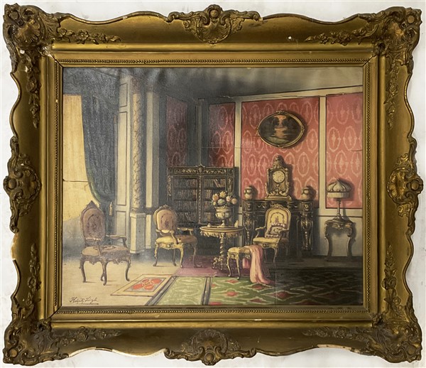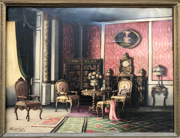 Laszlo Karpathy "Interno di salotto" olio su tela (cm 60x80) In cornice (difetti