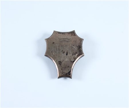 Scudetto nobiliare in metallo argentato con inciso monogramma "CBd'A" e corona comitale con attacco posteriore a scatto. Caratteristica forma a tête de cheval in uso del periodo della Restaurazione. Probabilmente Piemonte - Regno di Sardegna, 1820 - 1830. Tale scudetto veniva inserito in un'asola che precedentemente era stato creato su una marsina o divisa militare
