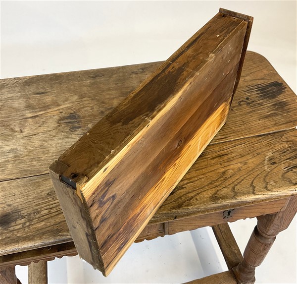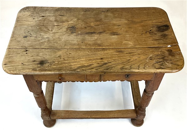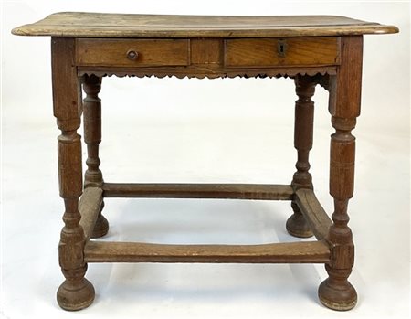 Antico tavolino a due cassetti con gambe tornite riunite da traverse (cm 103x79x57) (gravi difetti e sostituzioni)