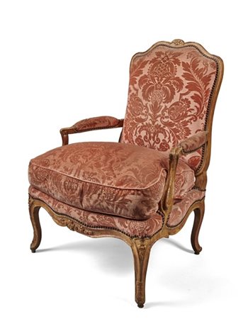 Poltrona di forma sagomata con seduta e schienale rivestiti in raso di seta borchiato. Secolo XVIII (difetti)