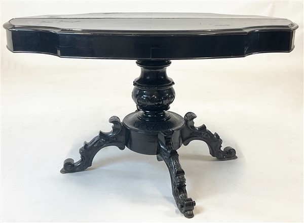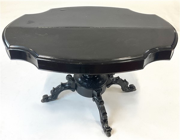 Tavolo a biscotto in legno ebanizzato con sostegno a colonna tornita su quattro piedi sagomati. Secolo XIX (cm 140x80x90) (difetti e mancanze)