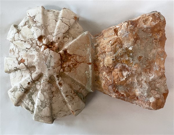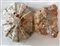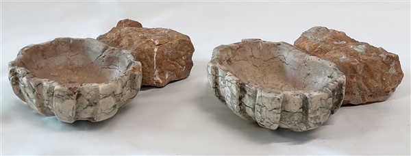 Coppia di antiche acquasantiere in marmo rosa con coppa scolpita a valva di conchiglia (cm 26x20) (difetti)