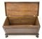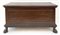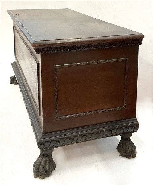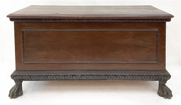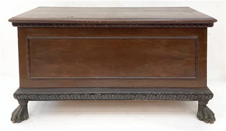 Cassapanca in legni vari con bordure intagliate e piedi ferini (cm 112x56x47) (lievi difetti)