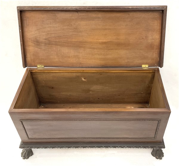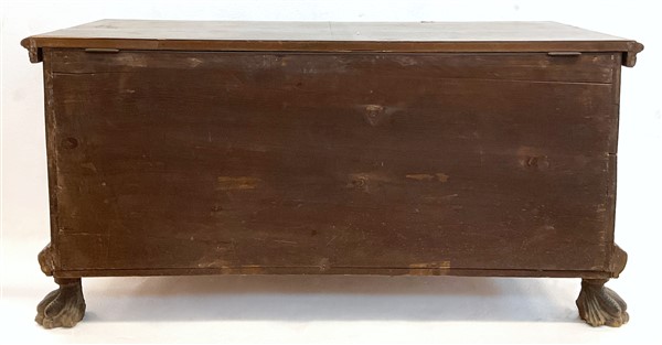 Cassapanca in legni vari con bordure intagliate e piedi ferini (cm 112x56x47) (