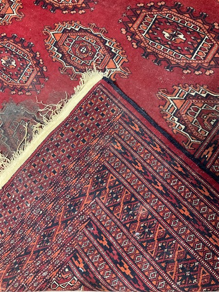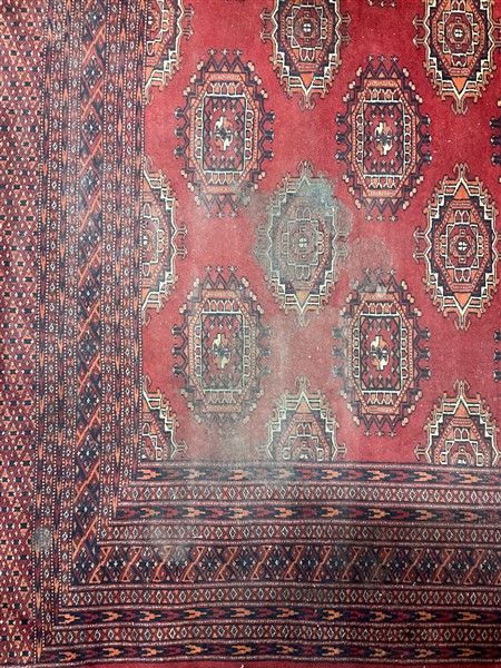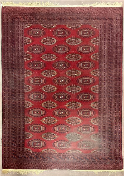 Tappeto Boukhara, Pakistan, secolo XX. Decoro con Gul su fondo rosso (cm 280x192) (difetti)