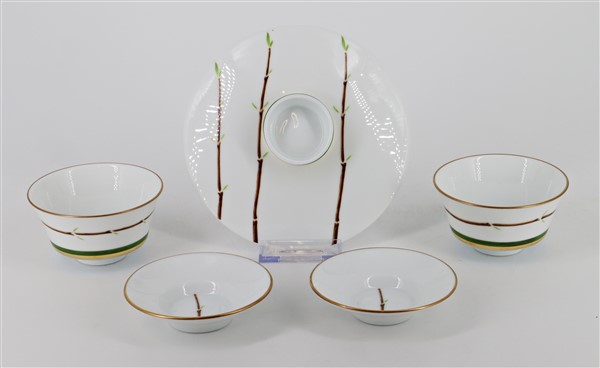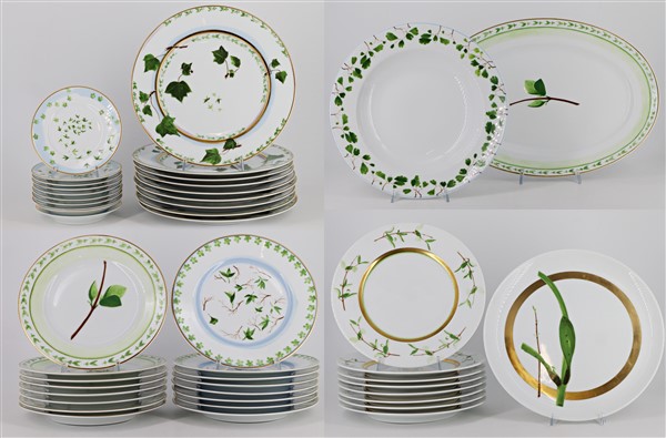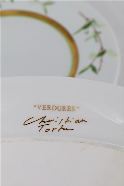 Manifattura di Limoges, A. Raynaud & Co., modello Verdures. Parti di servizi per la tavola in porcellana dipinta in policromia con decoro differente a motivo vegetale e profili in oro. In due cartoni (difetti)