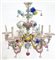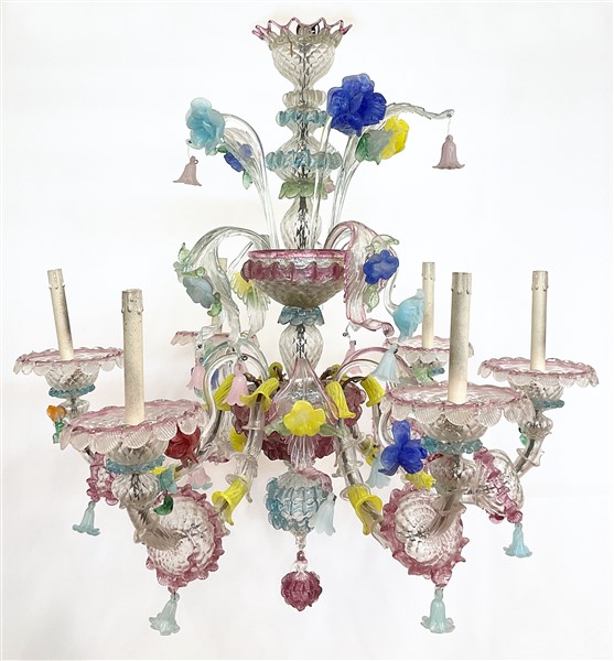 Manifattura di Murano, secolo XX. Lampadario a sei luci in vetro policromo con pendenti e decori floreali (h cm 116) (difetti)
