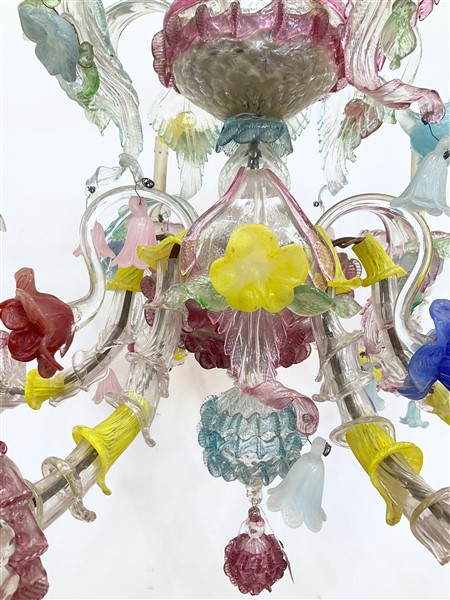 Manifattura di Murano, secolo XX. Lampadario a sei luci in vetro policromo con
