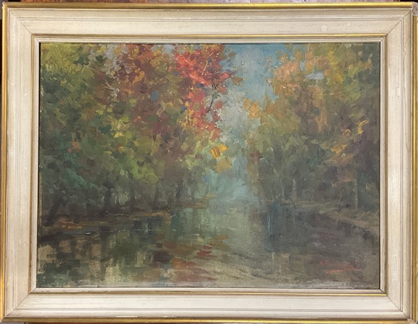 Giuseppe Solenghi "Scorcio lacustre in autunno" olio su cartone telato (cm 45x6