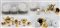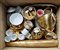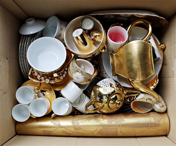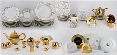 Manifatture differenti. Lotto composto da diverse tazzine con piattini, due teiere, piatti di diversa misura e oggetti per la tavola in porcellana con dorature di decori differenti. In un cartone (difetti)