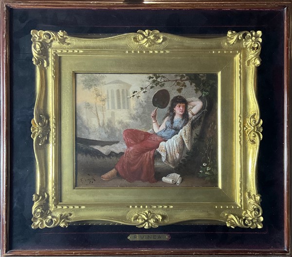 Ignoto del secolo XIX "Odalisca sull'amaca entro paesaggio" olio su tavola (c
