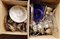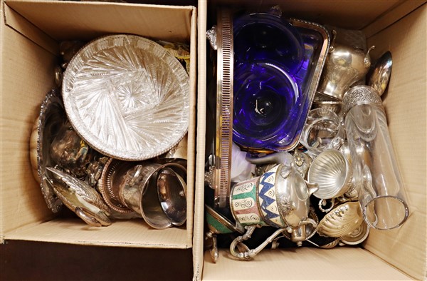 Lotto composto da numerosi oggetti in metallo argentato di forme, usi e decori differenti. In due cartoni (difetti)