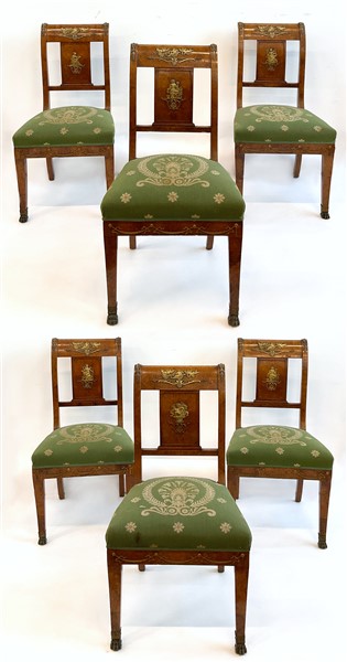 Gruppo di sei sedie in stile Impero impiallacciate in radica di tuia e decorate