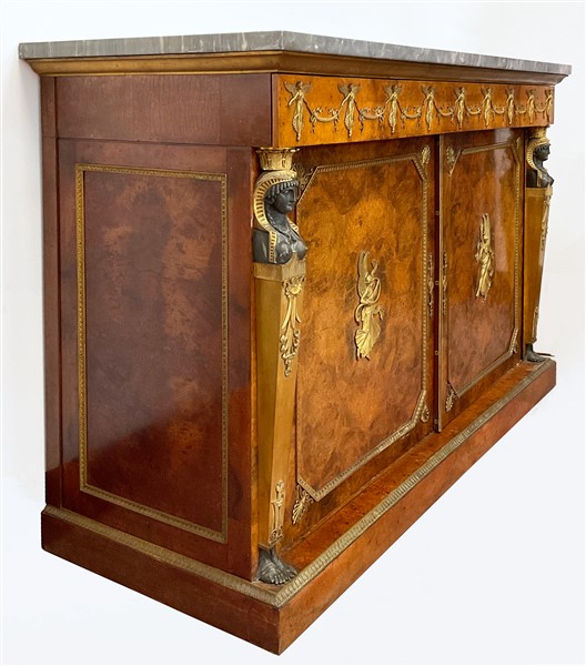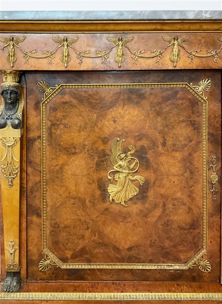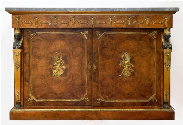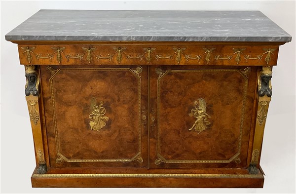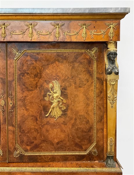 Credenza in stile Impero impiallacciata in radica di tuia a due ante e un cassetto con montanti a erma in bronzo dorato e brunito. Bordure e fregi a figure alate in bronzo dorato, piano in marmo. (cm 155x103x60) (difetti)