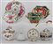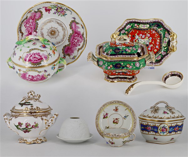 Manifatture diverse, secolo XIX- XX. Lotto composto da una tazza da puerpera con coperchio e piatto, due diverse zuccheriere con coperchio, una salsiera con coperchio, piatto e mestolino, una tazzina con piatto e altro oggetto in porcellana. In un cartone (difetti)