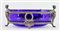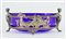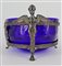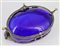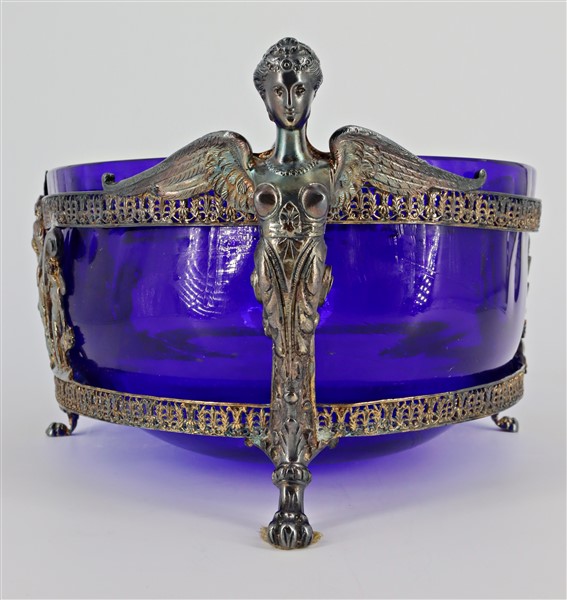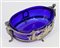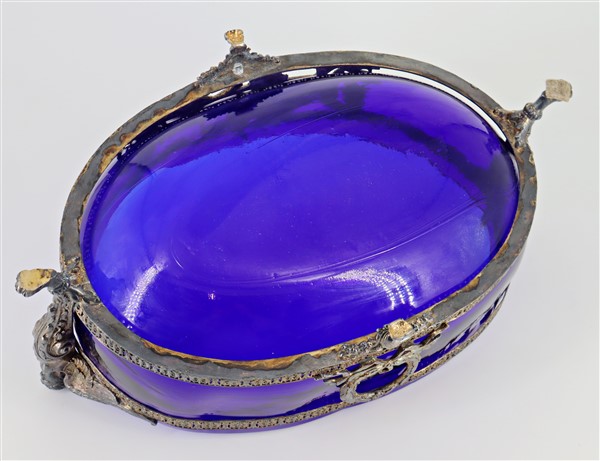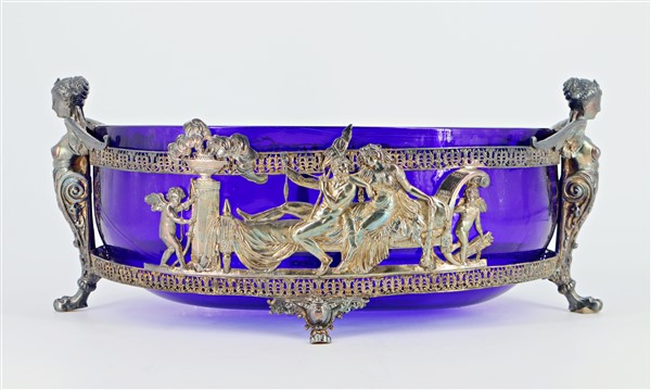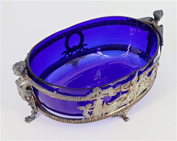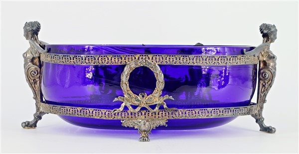Fioriera in metallo argentato di forma ovale con anse ad erma alata e piedi ferini, interno con vasca in vetro blu (cm 37x22) (difetti)