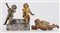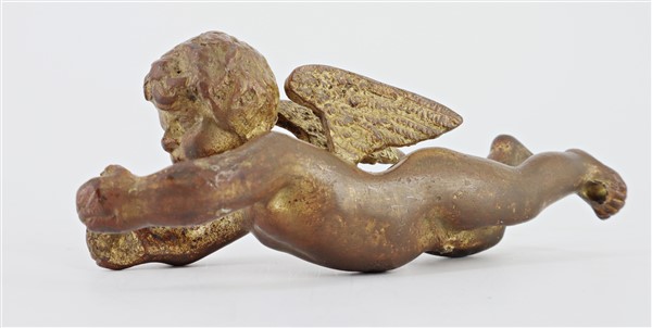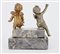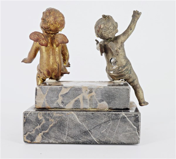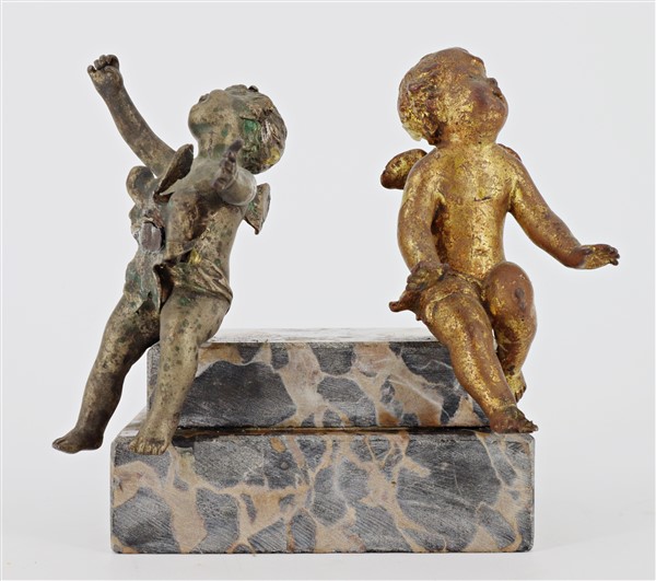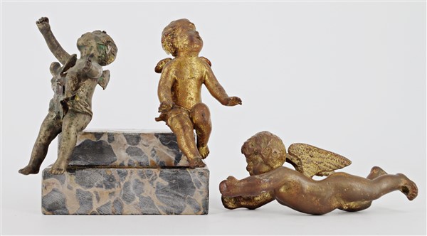 Lotto composto da due antichi angioletti in bronzo montati su base gradinata in marmo uniti ad un angelo in bronzo, tracce di doratura. (cm 16x14) (difetti)