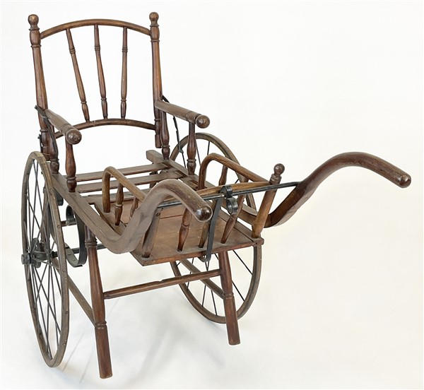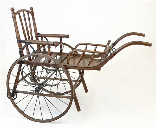 Risciò in faggio tornito e curvato con schienale reclinabile e grandi ruote. (L. cm 123) (difetti)
