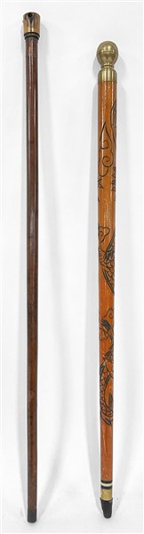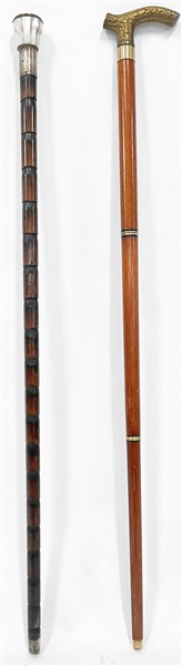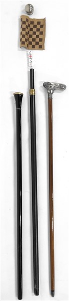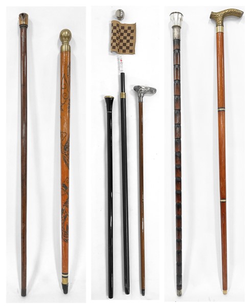 Arte del secolo XIX-XX. Lotto composto da sette differenti bastoni di forme e decori diversi, uno con pomolo in argento e bussola, uno con pomolo in madreperla e argento, alcuni contenenti giochi e attrezzi (h. max cm 92) (difetti)