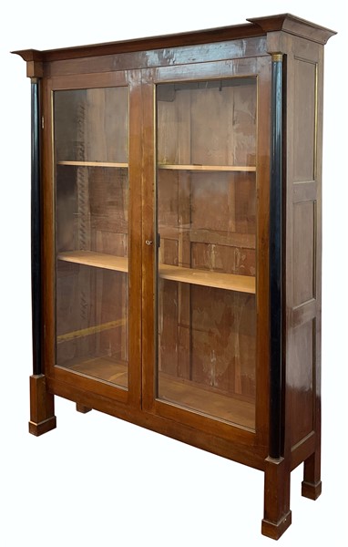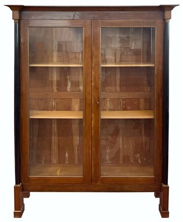 Libreria Impero in noce a due ante con vetro, fianchi pannellati, montanti a colonna ebanizzata con fregi in bronzo dorato, piedi a plinto. Secolo XIX (cm 171x216x44) (difetti)