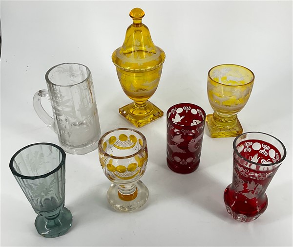Manifatture diverse, lotto composto da cinque diversi bicchieri, un boccale e una coppa con coperchio in vetro inciso, alcuni a fondo colorato (h max cm 22) (lievi difetti)