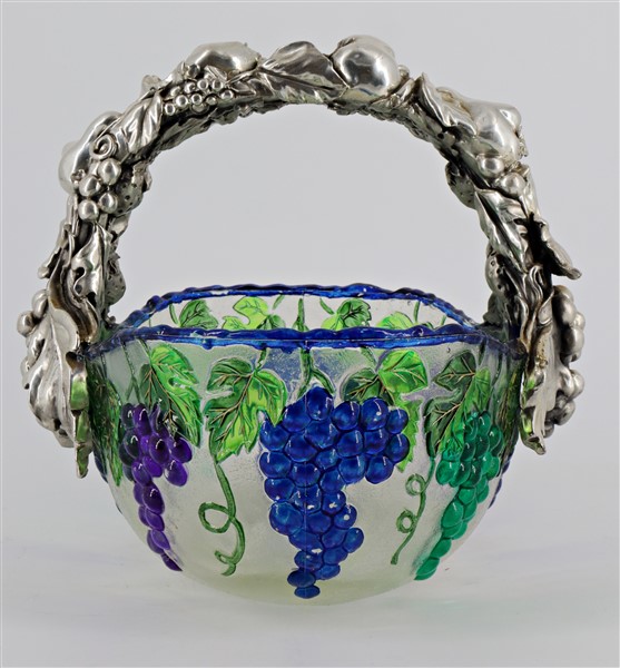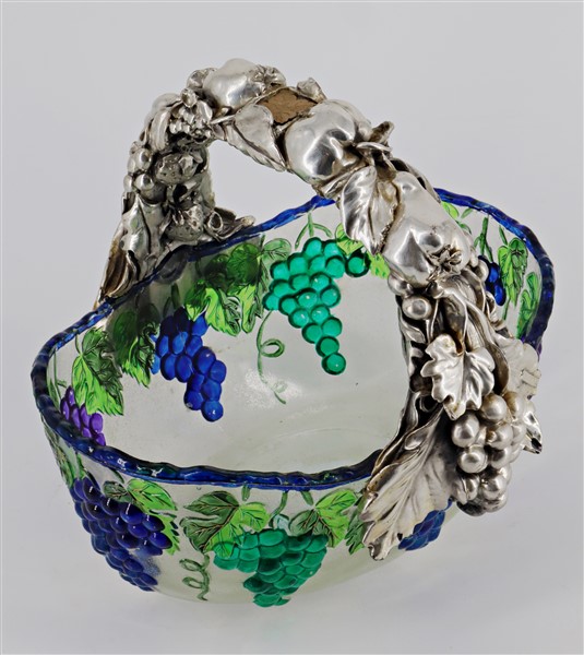 Cestino in vetro policromo a grappoli d'uva con manico laminato in argento a frutti (cm 25x20) (difetti)