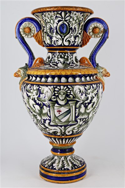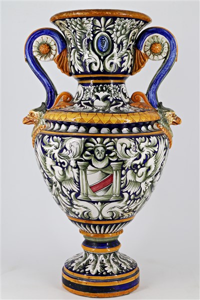 Manifattura del secolo XX. Grande vaso biansato in maiolica policroma con decor