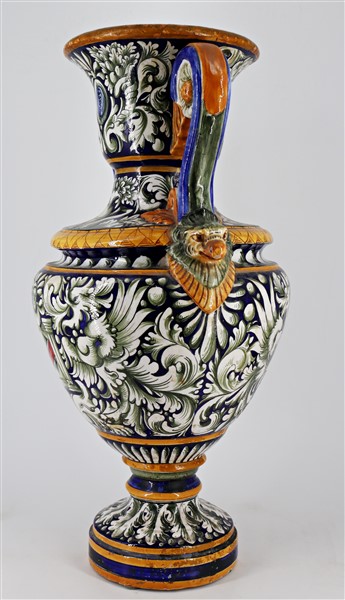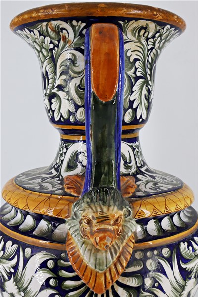 Manifattura del secolo XX. Grande vaso biansato in maiolica policroma con decoro a volute fogliate (h. cm 63) (difetti)