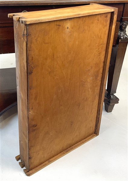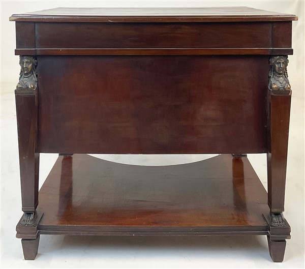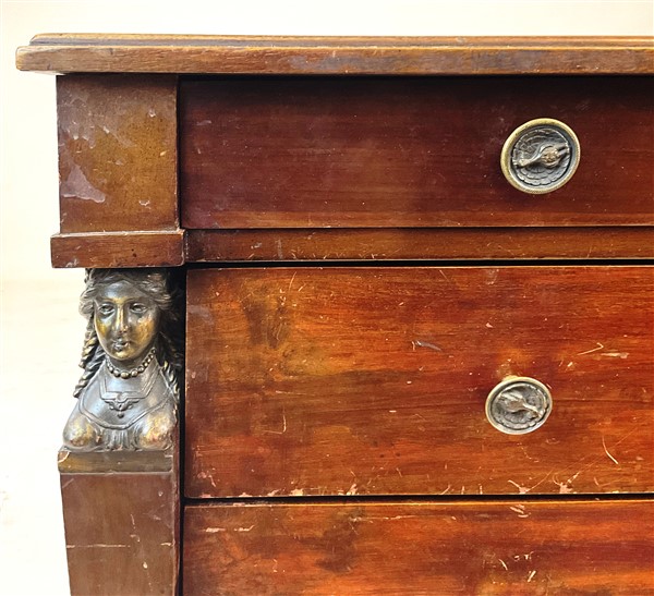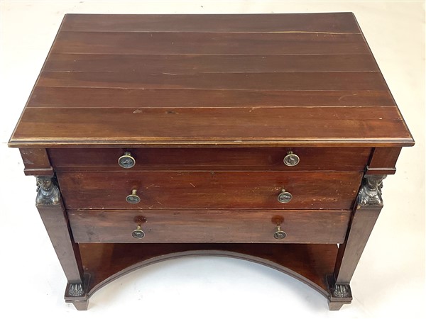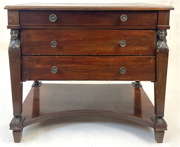 Mobile da centro in mogano in stile Impero a tre cassetti frontali, montanti rastremati su ambo i lati con capitelli ad erma e piedi antropomorfi (cm 88x75x58) (difetti)