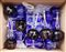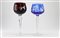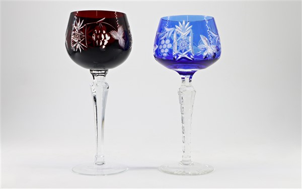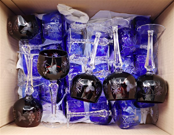 Lotto composto da numerosi calici in vetro molato con tralci di vite e grappoli d'uva in blu e rosso. In un cartone (difetti)