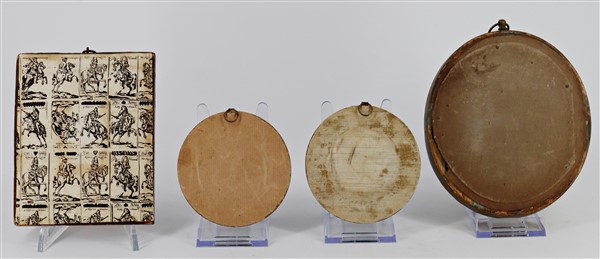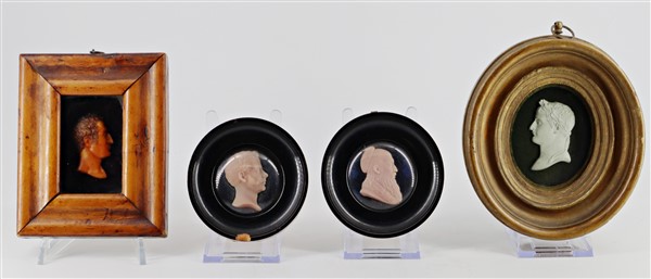 Arte del secolo XIX. Lotto composto da tre diversi profili maschili in cera ed uno in gesso, raffiguranti personaggi tra cui Hayez, Tiziano e Napoleone, in cornici (cm max totale 16x14) (difetti)