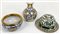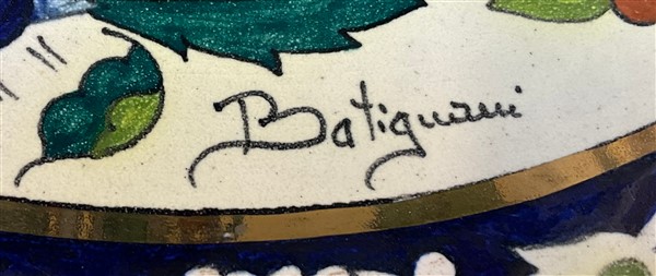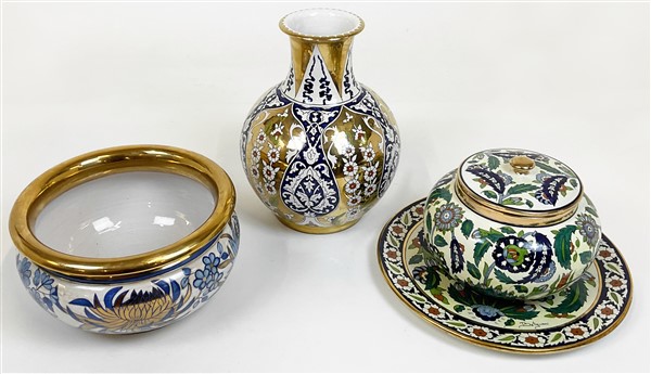 Manifattura Batignani, secolo XX. Lotto composto da un vaso, una potiche con coperchio e piatto ed un cache-pot in ceramica decorati in policromia con bordure dorate (h. max cm 40) (lievi difetti)
