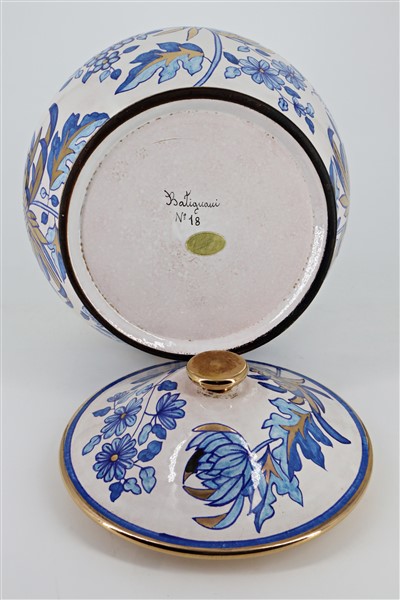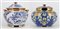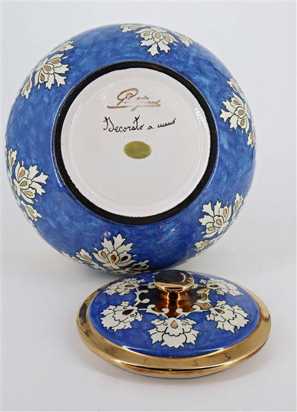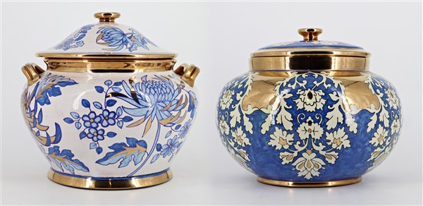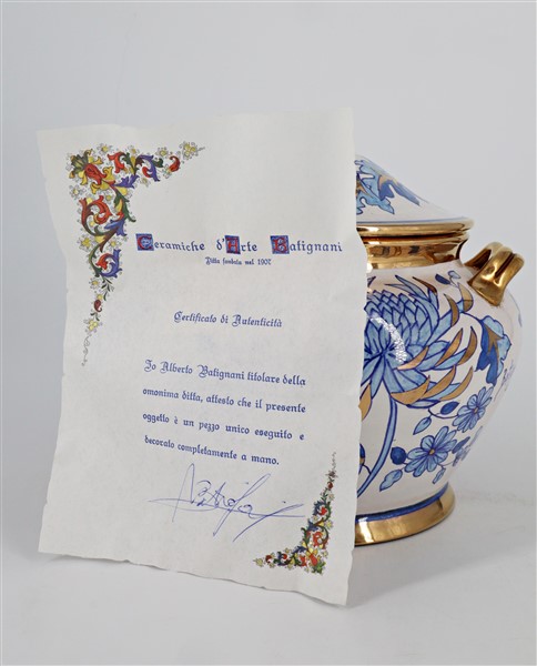 Manifattura Batignani, secolo XX. Lotto composto da due potiche con coperchio in ceramica decorata a fiori nei toni del blu e oro (h max cm 38,5) (lievi difetti)