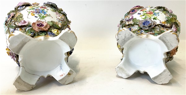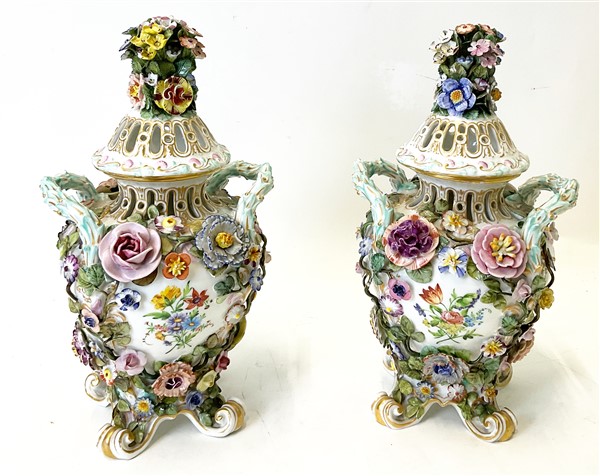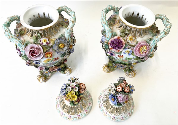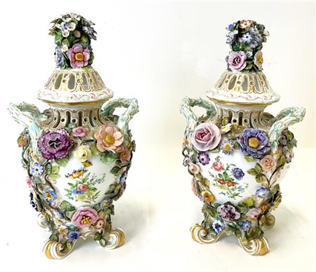 Manifattura tedesca. Coppia di vasi biansati in porcellana con coperchio e collo traforati riccamente decorati a rilievo con rami fioriti e mazzetto entro riserva, profili in oro (h cm 35) (difetti e rotture)