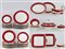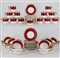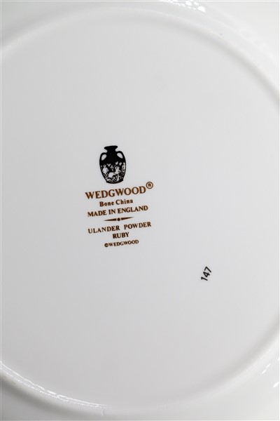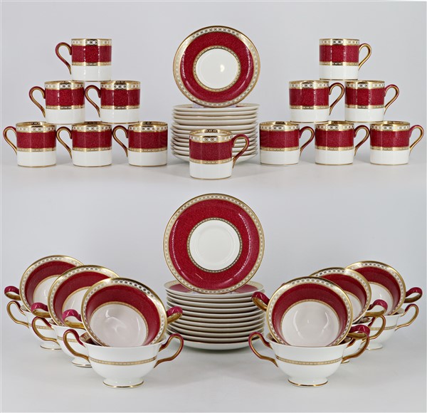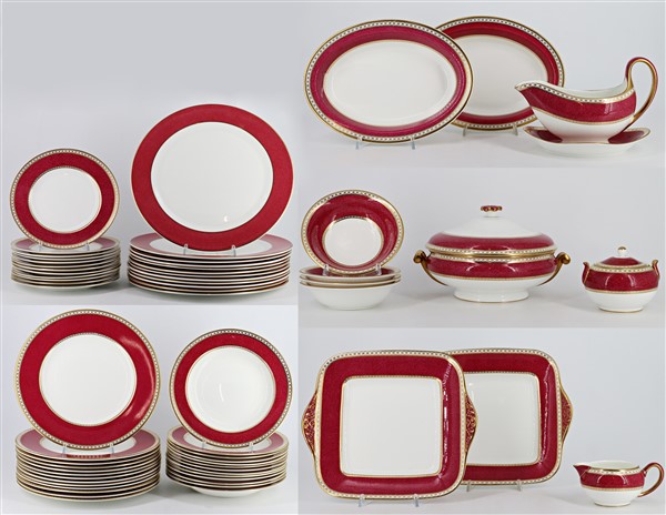 Manifattura di Wedgwood. Servizio da tavola in porcellana con bordure in spugnato rosso e decori in oro composto da tredici piatti piani, tredici fondine, dodici sottopiatti, dodici piatti da frutta, tredici tazze da caffè con piattino, dodici tazze da brodo con piatto, quattro ciotole, una salsiera, una zuccheriera, una lattiera, una zuppiera con coperchio, cinque diversi piatti da portata. In tre cartoni (difetti)