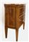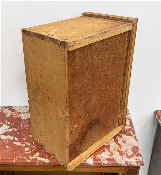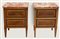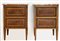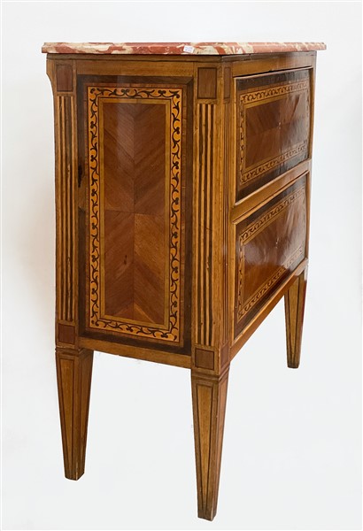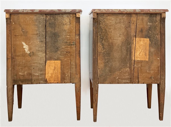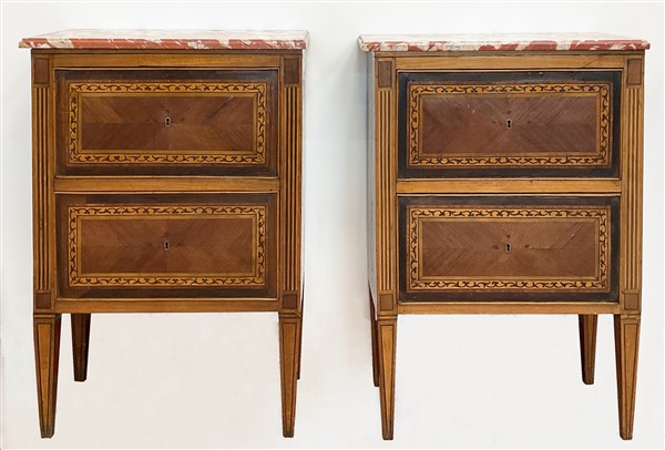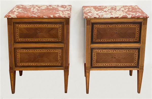 Coppia di comodini lastronati in noce, filettati e intarsiati in legni vari con fronte a due cassetti, gambe ad obelisco rovesciato. Fine secolo XVIII. Piani in marmo d'epoca successiva. (cm 63x88x33) (difetti e restauri)