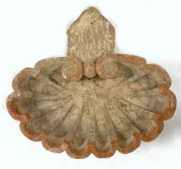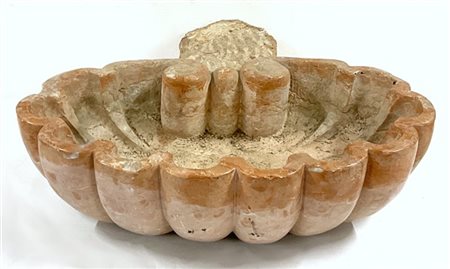 Antica acquasantiera in marmo rosa scolpito a valva di conchiglia (cm 57x52) (difetti)