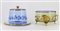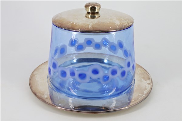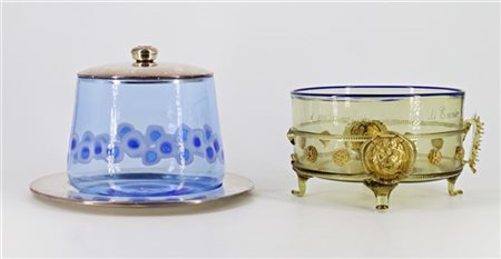 Lotto composto da una compostiera con coperchio e piatto in vetro soffiato blu trasparente con fascia a murrine lattimo e metallo, ed un'alzatina in vetro di gusto tradizionale della manifattura Giampaolo Nason. Seconda metà secolo XX.