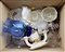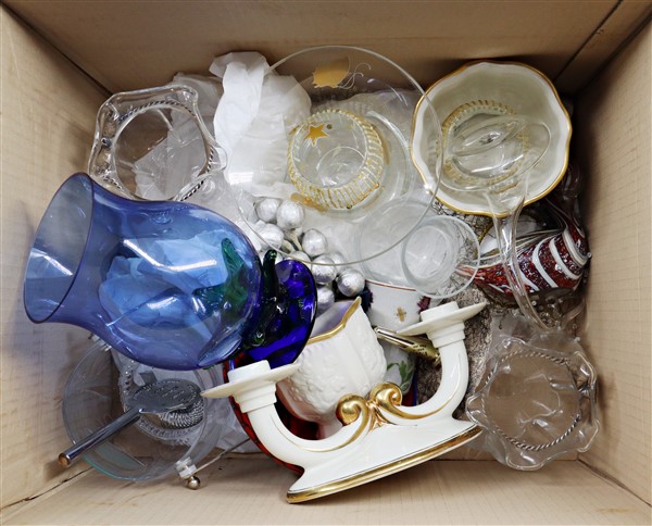 Lotto composto da numerosi oggetti in vetro e in ceramica di forme e decori differenti. In un cartone (difetti)