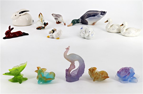 Manifatture differenti. Lotto composto da numerose figure di animali e fiori in pasta vitrea, porcellana e altri materiali. In un cartone (difetti)