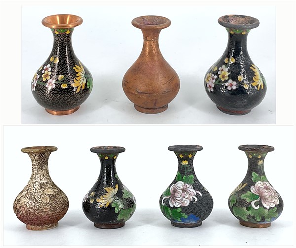 Lotto composto di sette vasetti in metallo cloisonnè entro scatola Cina, secolo
